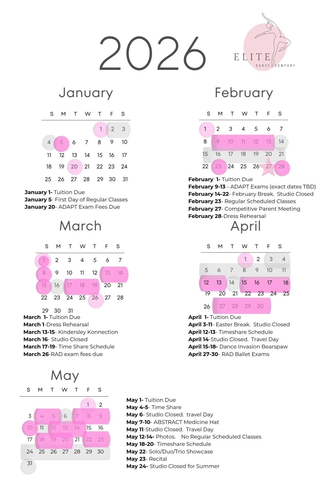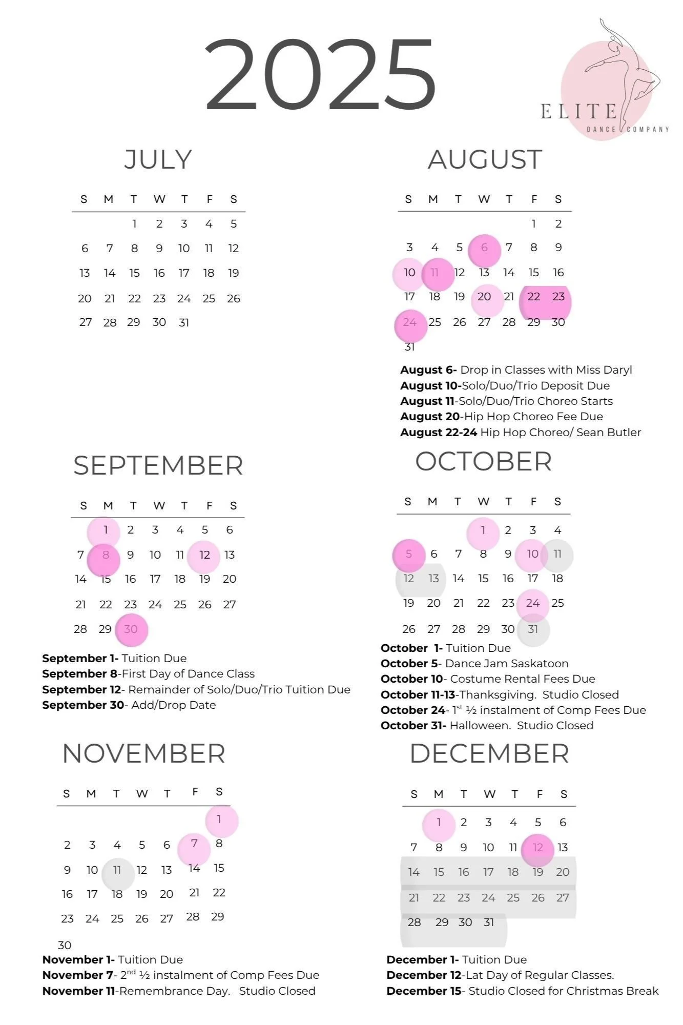 Scroll down to the bottom left corner of the Elite Dance Company Calendar (on this webpage).